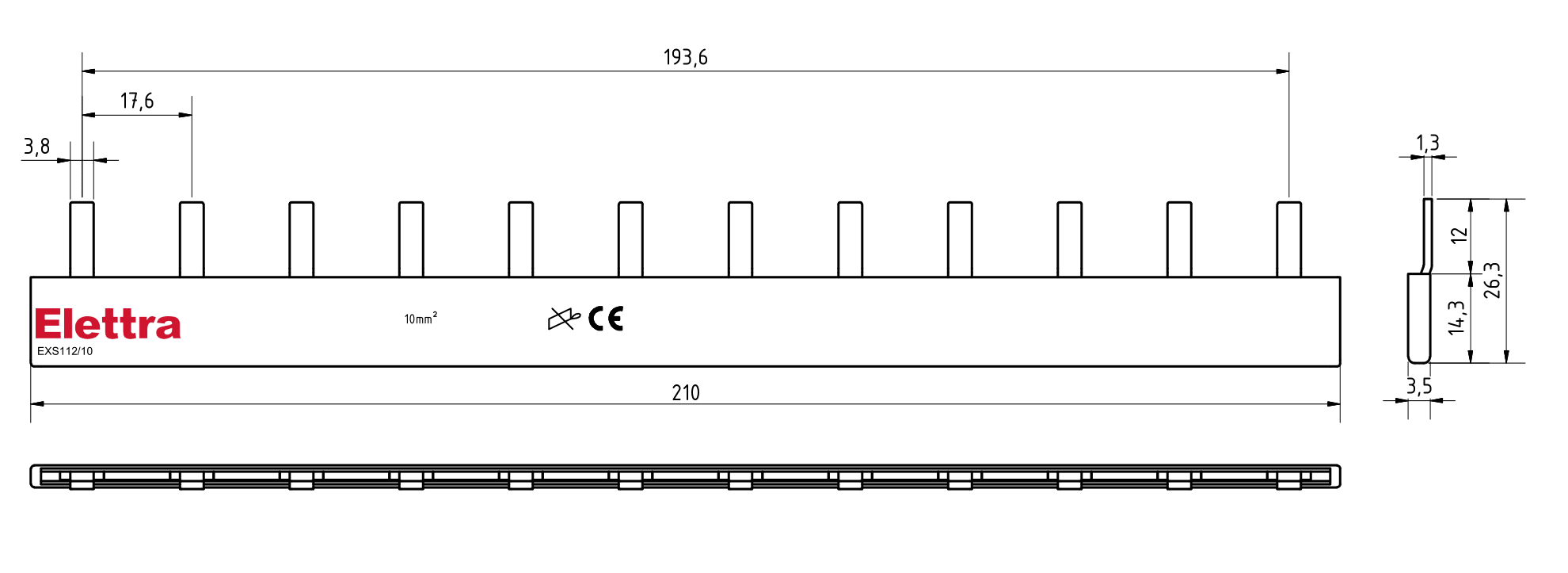 Barra di collegamento a puntale per la serie modulare Elfa NEXT, numero di poli 1P, numero di moduli 12, numero di PIN 12, sezione trasversale 10mm2, corrente nominale 63A, lunghezza 210mm, passo 17,6mm