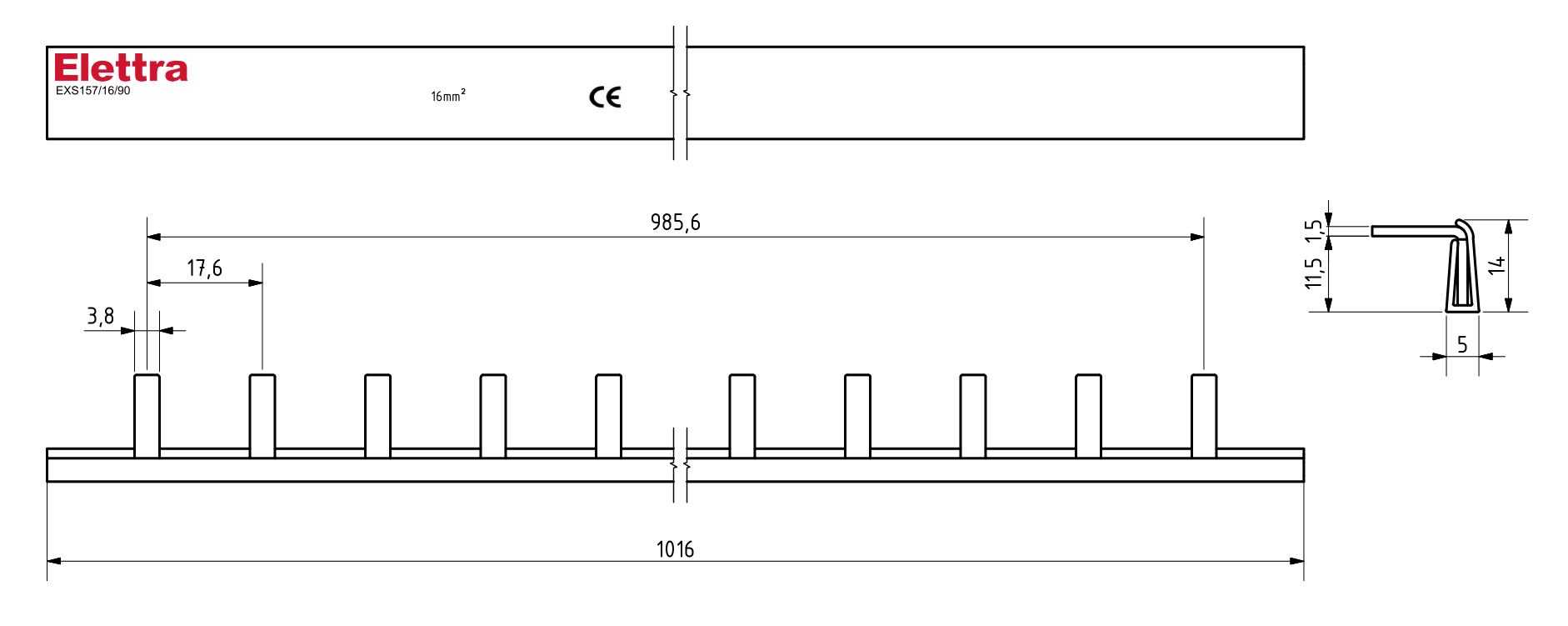 Barra di collegamento a puntale per la serie modulare Elfa NEXT, numero di poli 1P, numero di PIN 57, sezione 16mm2, corrente nominale 80A, passo 17,6mm 90°