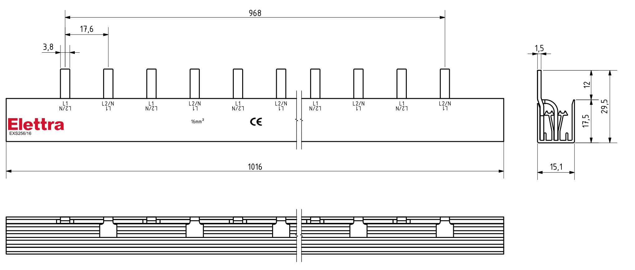 Barra di collegamento a puntale per la serie modulare Elfa NEXT, numero di poli 2P, numero di PIN 56, sezione 16mm2, corrente nominale 80A, passo 17,6mm