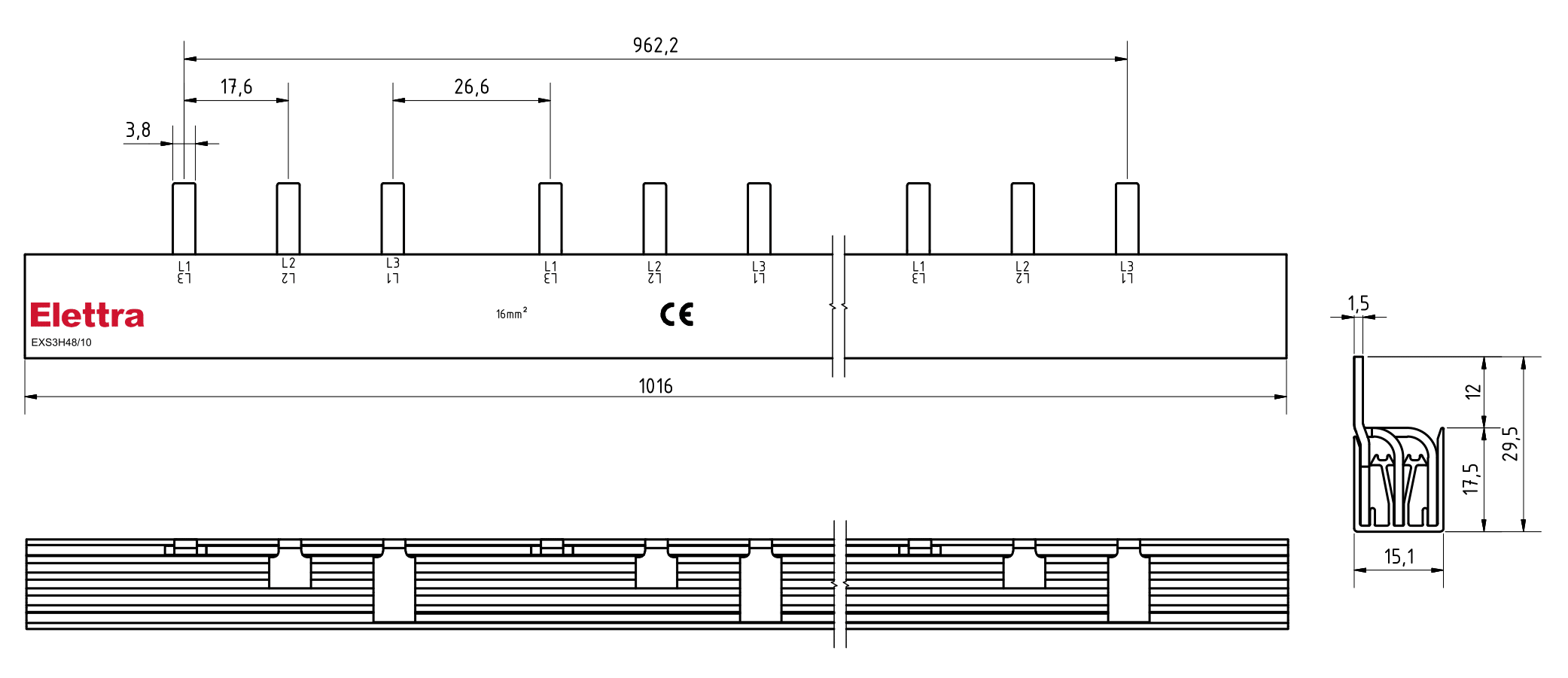 Barra di collegamento a puntale per la serie modulare Elfa NEXT, numero di poli 3P+aux, numero di PIN 48, sezione 10mm2, corrente nominale 63A, passo 17,6mm