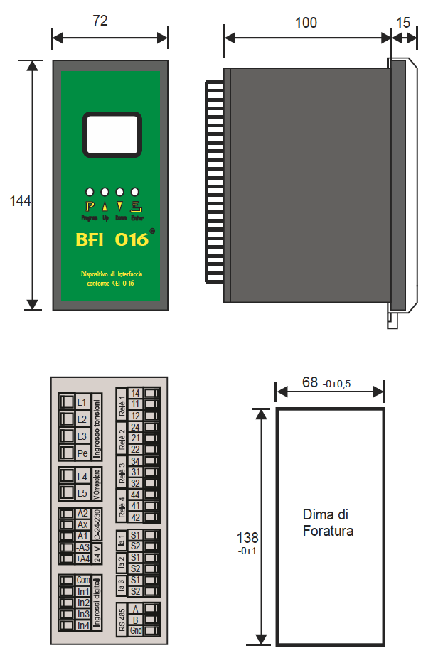 Dispositivo di interfaccia per la connessione di impianti fotovoltaici e di generazione in MT secondo la norma CEI 0-16; impiego trifase, 4 moduli; permette il controllo di minima e massima tensione e frequenza, dotato di funzione di sgnacio per rincalzo integrata; comunicazione Modbus RS485, tensione ausiliaria 230VAC.