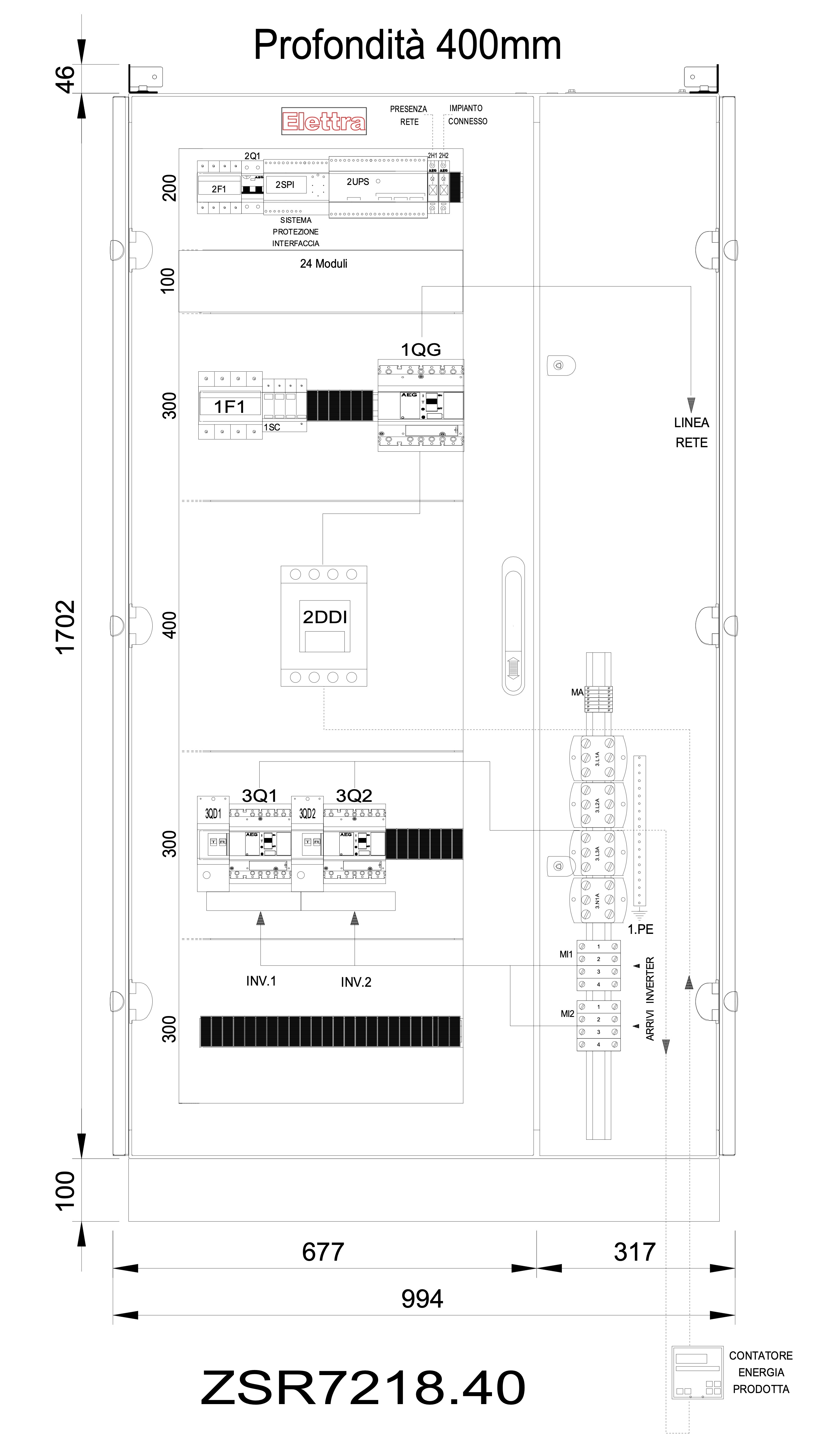 Quadro interfaccia CEI 0-21 per impianti fotovoltaici di potenza limite 125 kW. Il quadro è composto da: interruttore automatico magnetotermico 4x200A 36kA + rincalzo, protezioni inverter tramite interruttore magnetotermico differenziale in classe A 300 mA o con Id regolabile, contattore DDI 4P 190A AC-3, scaricatore di Tipo 2, relè di interfaccia NA003 con soccorritore secondo CEI 0-21, interruttore magnetotermico differenziale per protezione ausiliari, lampade di presenza tensione e impianto connesso. Tutti i componenti sono racchiusi all’interno di un contenitore metallico IP55 con porta vetro + vano laterale, dimensioni LxHxP 994×1800×400 mm.